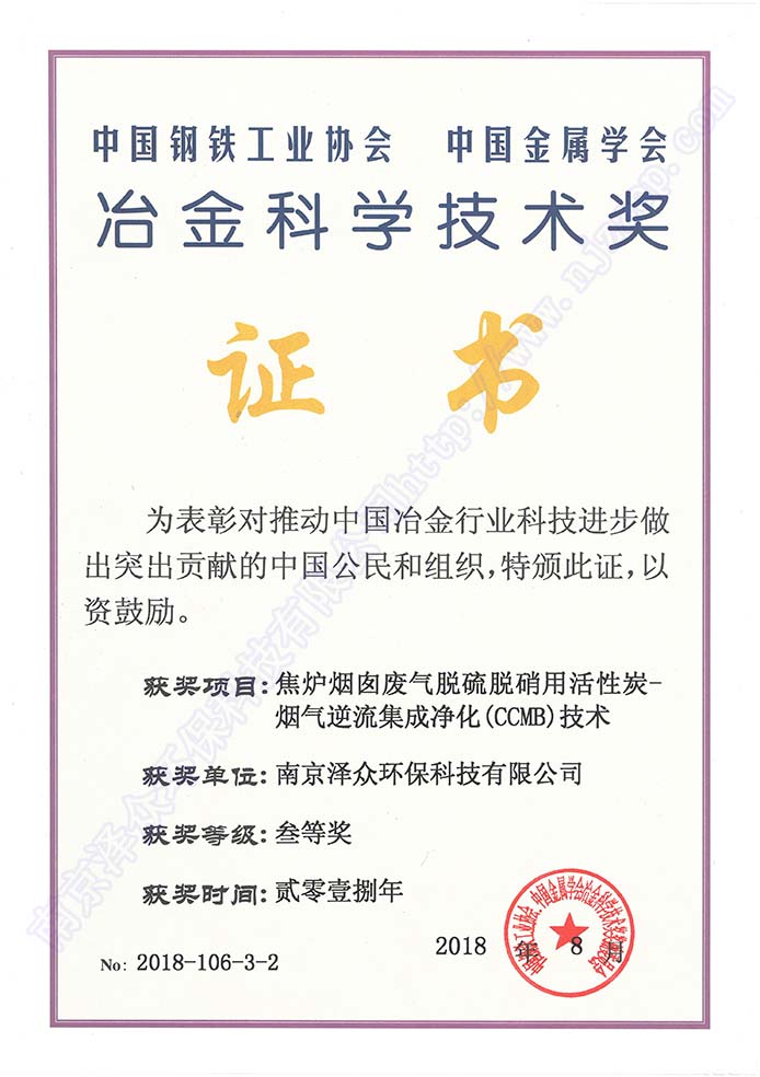 南京澤眾環??萍加邢薰咀溆谀暇┦杏昊ㄅ_區,注冊資本6000萬元,2017年被認定為高新技術企業,2018年被認定為瞪羚企業,入選中國鋼鐵技術與服務供應商品牌企業,被評為鋼鐵產業鏈綠色標桿企業,與浙江工業大學合作成立聯合研發中心,入股河南安鋼澤眾冶金設計有限責任公司,牽頭起草《燒結煙氣活性焦干法脫硫、脫硝技術規范》和《焦爐煙氣聯合脫硫脫硝技術規范》。 公司專長于活性炭煙氣凈化技術,創新能力突出,成功研發具有獨立自主知識產權的活性炭-煙氣逆流集成凈化CCMB(ActivatedCarbon Countercurrent Moving Bed)技術,形成獨立自主知識產權體系,由中國金屬學會評價鑒定達到國際領先水平,獲得冶金科技三等獎,被評為“鋼鐵產業鏈綠色低碳好技術”,入選中國鋼鐵工業協會先進節能環保技術,入選生態環境部國家先進污染防治技術目錄推廣技術。